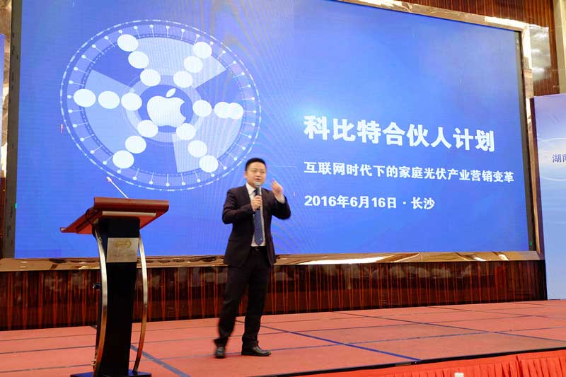 會上,集團(tuán)市場總監(jiān)周亞玲做了湖南省光伏扶貧模式的探討,公司副總經(jīng)理羅勇對在移動互聯(lián)網(wǎng)時代下的“綠色能源+互聯(lián)網(wǎng)”進(jìn)行了系統(tǒng)的講解,公司相應(yīng)負(fù)責(zé)人對光伏發(fā)電站的工程建設(shè)以及“科比特合伙人計劃”等方面進(jìn)行了詳細(xì)介紹,此外,公司總經(jīng)理譚維益著重在會上就科比特高效逆變器新品進(jìn)行了發(fā)布和技術(shù)講解。