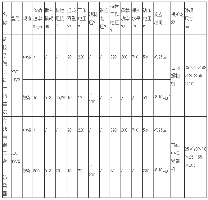 KBT-V2二合一監(jiān)控多功能防雷器采用BNC視頻接口,適用普通攝像機、固定攝像機、紅外機的防雷保護。電源工作電壓分24V(交、直流通用),信號工作電壓為6-12V。