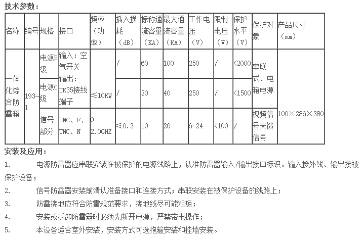 1.一體化綜合防雷箱電源防護(hù)、信號(hào)防護(hù)及等電位接地于一體;